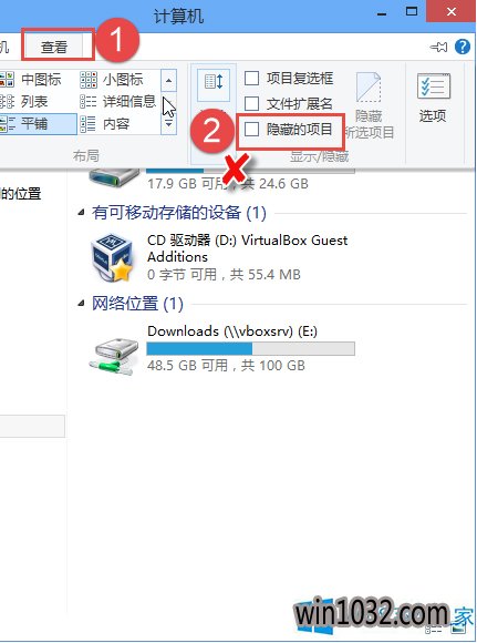 4、按win+E键点击文件资源管理器。在菜单栏上打开“查看”,工具区打开取消选择“隐藏的项”,这个不要选择。