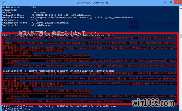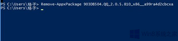 4、继续写入Remove-AppxPackage 《你要卸载的PackageFullName》,PackageFullName就是程序包返回的信息,比如小编要卸载是QQ,则写入Remove-AppxPackage 903DB504.QQ_2.0.5.810_x86__a99ra4d2cbcxa。