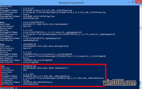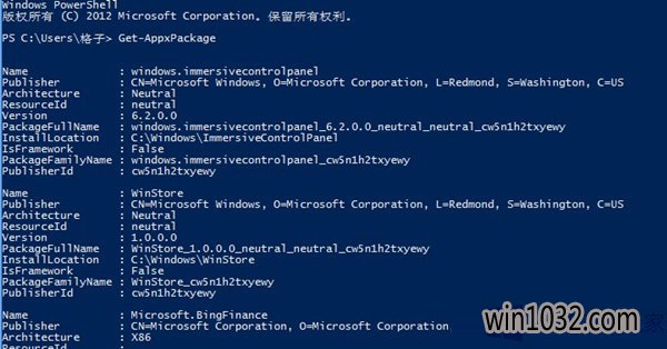 2、在windows PowerShell界面写入Get-AppxPackage并回车,它能够返回所有安装的Metro程序包信息。