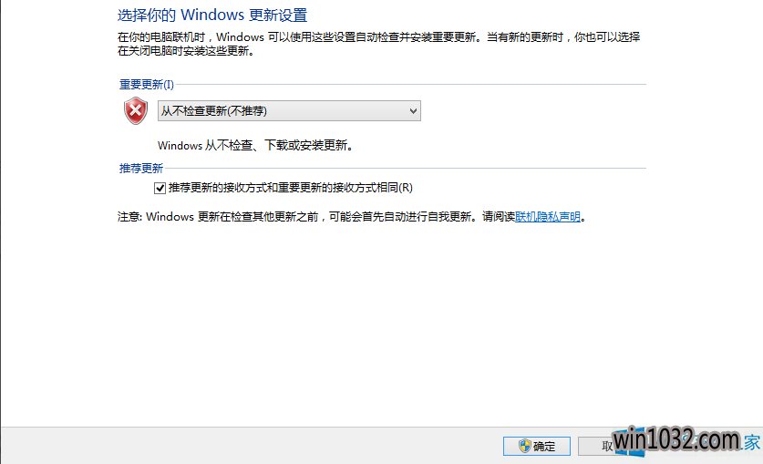 3、在重要更新里面选中从不检查更新,以后确定就可以了。