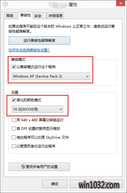 2、在以兼容模式运行程序前面打勾,选中windows XP(service Pack 2),另外在简化的颜色模式前面打勾,选中16位,打开确定;
