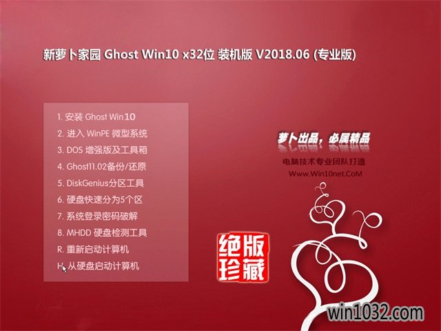 新萝卜家园Ghost Win10x32位装机版V2018.06版本集成了大量驱动,也可以适应其它电脑系统安装,在默认安装设置服务的基础上,新萝卜家园Ghost Win10x32位装机版关闭了少量服务,包括终端服务和红外线设备支持。欢迎需要重装系统的朋友下载体验!