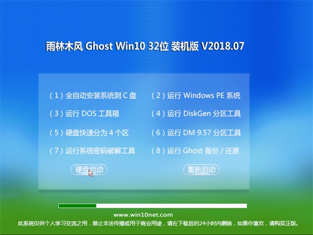雨林木风Win10x32位装机版系统仅用于进行演示基于万能GHOST的快速部署技术,除了系统和光盘中明确标识为原创 作品的软件外,其他的全部文件归属于原版权人所有。我们不承担任何技术和版权问题,没有提供任何技术支持的义务.请勿将本系统用于商业用途!