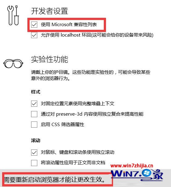 2、去除开发者设置中的“使用Microsoft兼容性列表”的勾选,同时请注意提示,需要重启EdGE浏览器才会生效;