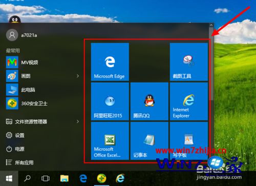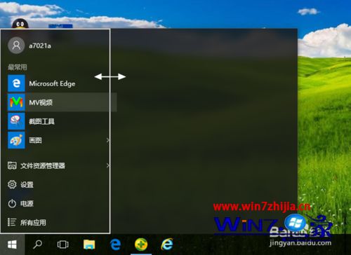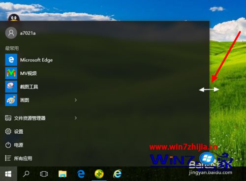 5、在按住移动鼠标左键的情况下,往左移动开始屏幕右侧边线到开始菜单右侧适当位置后再放开鼠标;