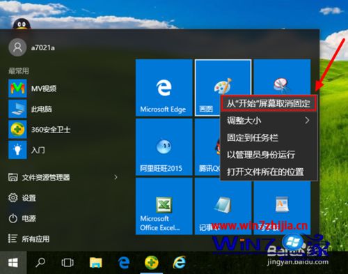 2、鼠标右键开始屏幕上某一磁贴,然后左键选中“从‘开始’屏幕取消固定”;