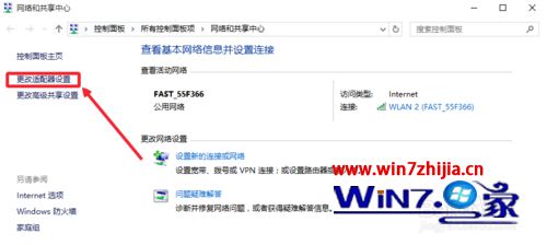 2、然后在跳出来的网络和共享中心中,咱们打开左侧的更改适配器设置打开进入;