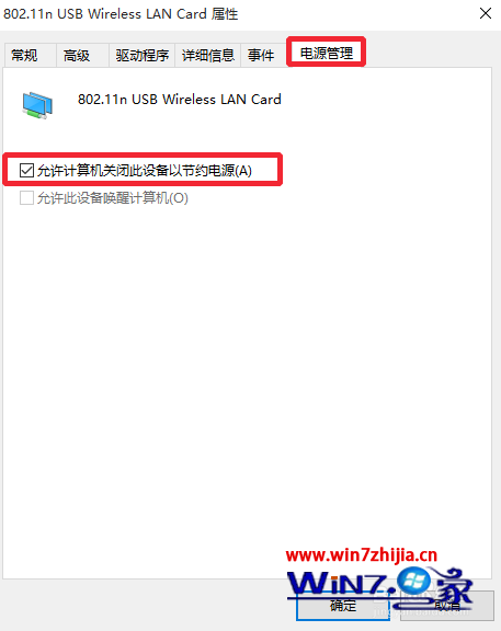 5、网卡属性中,在电源管理中允许计算机关闭此设备以节约电源,前面对勾取消。