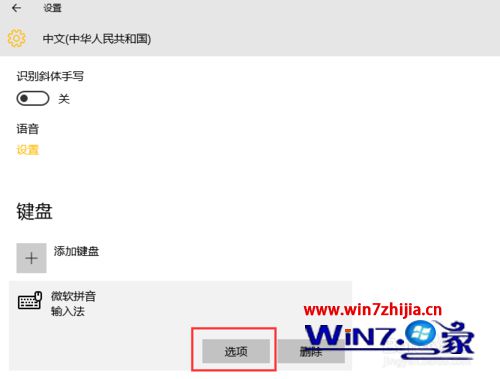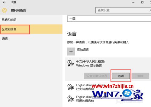 5、在左侧选中“区域和语音”,看到右侧“语音”打开中文(中华人民共和国)再打开“选项”;