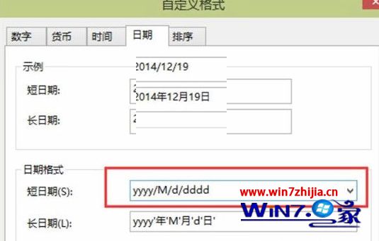 5、在自定义格式框中“日期”选项卡中,将日期格式下的短日期修改为“yyyy/M/d/dddd”,然后打开应用并确定便可。