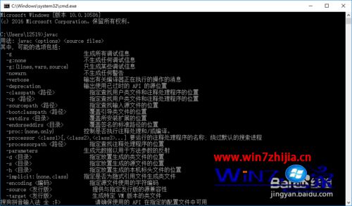 2、CMd中写入javac敲回车出现下面javac信息说明配置成功。