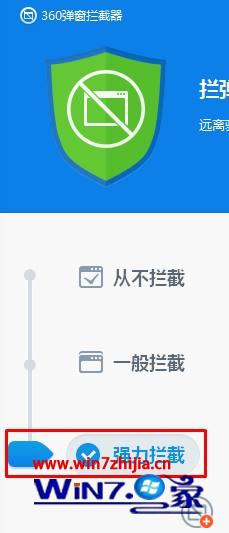 4、在跳出的“360弹窗拦截器”窗口中打开“强力拦截”便可。