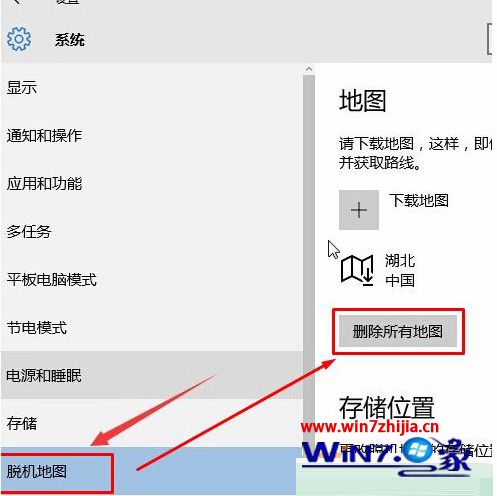 3、在右侧打开“脱机地图”,然后在右侧“删除所有地图”,删除完成后重启计算机,重头下载地图便可处理。