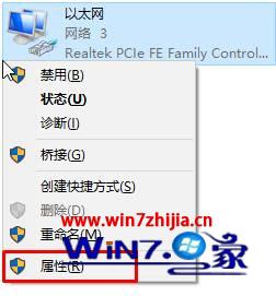 2、在当前所连接的“以太网”或“无线网”上点击右键,选中“属性”;