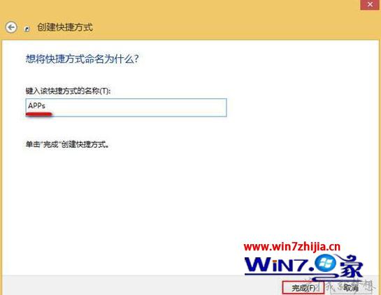 3、写入快捷方式的名称,例如:Apps,打开“完成”,如下图所示: