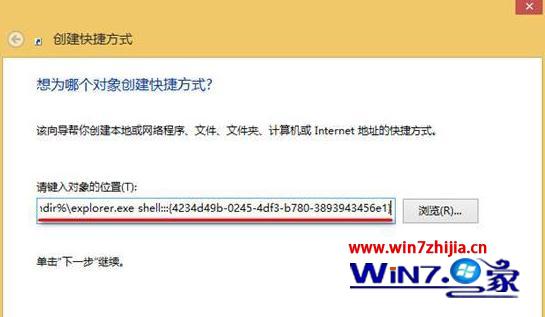 2、在创建快捷方式的“请键入对象的位置”写入代码“%windir%\explorer.exe shell:::{4234d49b-0245-4df3-b780-3893943456e1}”,然后点击“下一步”,如下图所示: