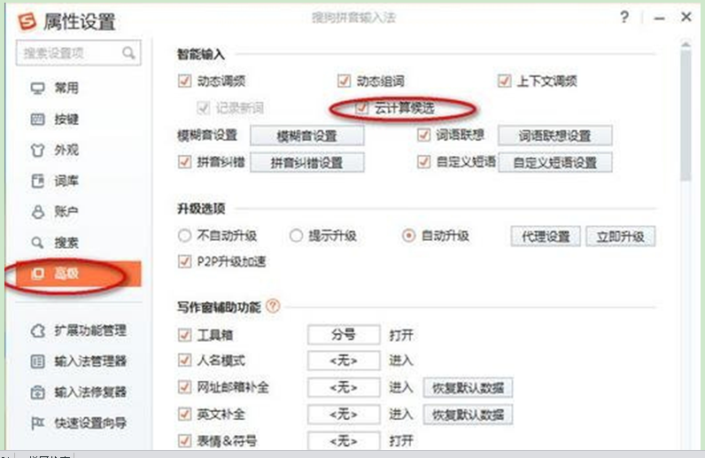2、在“属性设置”菜单栏中点选“高级选项卡”项,把“云计算候选”的复选款勾选取消就可以了。