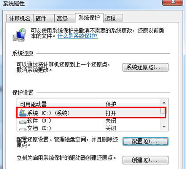 2、也可检查一下是不是因为C盘没有运行系统保护功能,如果是,那就将它开启即可,方法是在桌面“计算机”便捷图标上右键点击属性,接着单击左边的系统保护,查看C盘开启了系统还原没有,若是没有开启,那就选择“配置”之后在弹出的窗口中,点击“还原系统配置和以前版本的文件”选项。