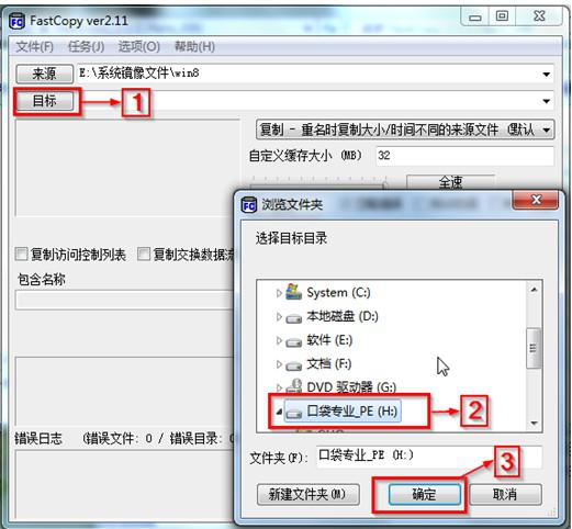 3、然后回到“FastCopy ver2.11”面板中,点选“目标”项,在弹现的“浏览文件夹”框中选定文件信息要被储存的区域,如图所示: