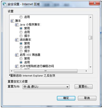在出现的“安全设置”框口下拉当中,寻找“java小程序脚本”和“活动脚本”等键值选择禁用,然后点击“确认”按钮保存。