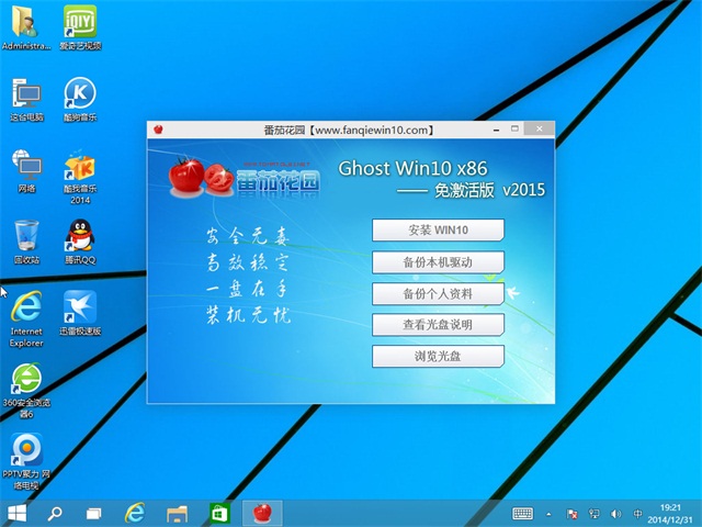 提取或解压本光盘镜像中的“win10.gho”和“GHOST\安装系统.exe”这两个文件到非系统盘且非中文目录下(例如:d:\或d:\abc123)并运行所得到“安装系统.exe”,然后按提示操作便可以自动安装本系统。