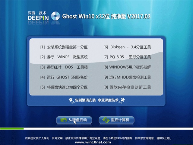 深度技术Win10x32位纯净版系统仅用于进行演示基于万能GHOST的快速部署技术,除了系统和光盘中明确标识为原创 作品的软件外,其他的全部文件归属于原版权人所有。我们不承担任何技术和版权问题,没有提供任何技术支持的义务.请勿将本系统用于商业用途。