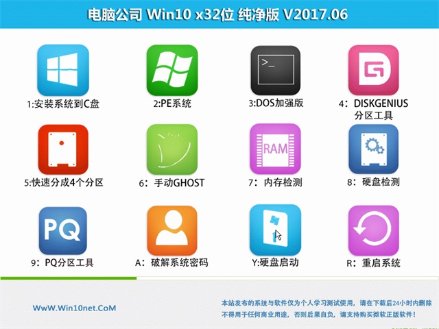 电脑公司Win10x32位纯净版系统仅用于进行演示基于万能GHOST的快速部署技术,除了系统和光盘中明确标识为原创 作品的软件外,其他的全部文件归属于原版权人所有。我们不承担任何技术和版权问题,没有提供任何技术支持的义务.请勿将本系统用于商业用途。