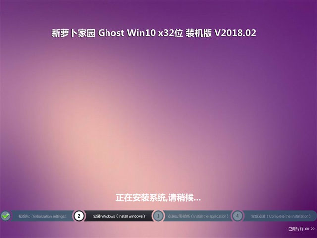新萝卜家园Win10x32位装机版系统仅用于进行演示基于万能GHOST的快速部署技术,除了系统和光盘中明确标识为原创 作品的软件外,其他的全部文件归属于原版权人所有。我们不承担任何技术和版权问题,没有提供任何技术支持的义务.请勿将本系统用于商业用途!