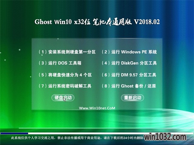 大白菜Win10x32位笔记本通用版系统仅用于进行演示基于万能GHOST的快速部署技术,除了系统和光盘中明确标识为原创 作品的软件外,其他的全部文件归属于原版权人所有。我们不承担任何技术和版权问题,没有提供任何技术支持的义务.请勿将本系统用于商业用途!