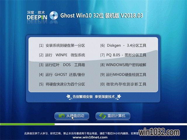 深度技术Win10x32位装机版系统仅用于进行演示基于万能GHOST的快速部署技术,除了系统和光盘中明确标识为原创 作品的软件外,其他的全部文件归属于原版权人所有。我们不承担任何技术和版权问题,没有提供任何技术支持的义务.请勿将本系统用于商业用途!