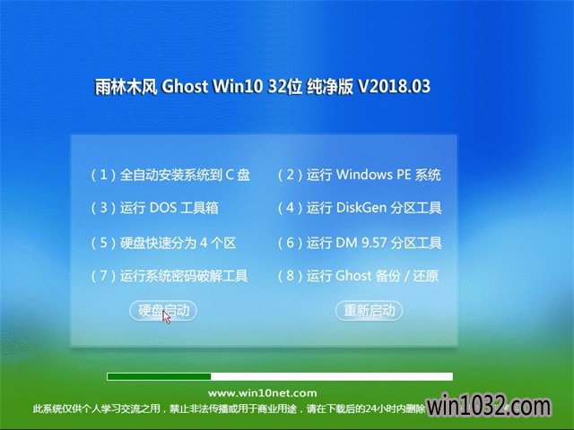 雨林木风Win10x32位纯净版系统仅用于进行演示基于万能GHOST的快速部署技术,除了系统和光盘中明确标识为原创 作品的软件外,其他的全部文件归属于原版权人所有。我们不承担任何技术和版权问题,没有提供任何技术支持的义务.请勿将本系统用于商业用途。