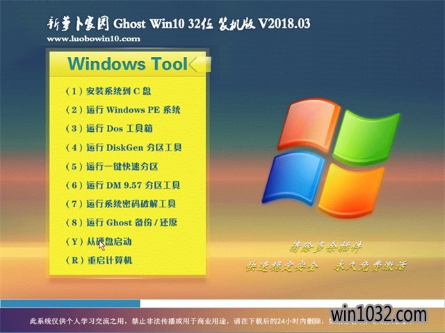 新萝卜家园Win10x32位装机版系统仅用于进行演示基于万能GHOST的快速部署技术,除了系统和光盘中明确标识为原创 作品的软件外,其他的全部文件归属于原版权人所有。我们不承担任何技术和版权问题,没有提供任何技术支持的义务.请勿将本系统用于商业用途!
