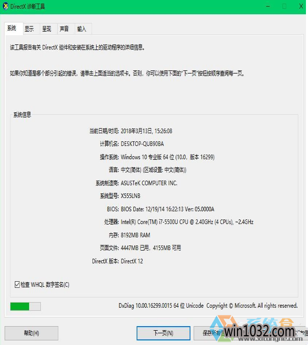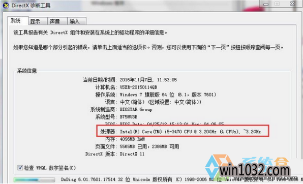 3、点击【开始】,输入【didiag】-【运行】,然后点击【确认】,就可以打开DirectX诊断工具,用户可以通过这个诊断工具查看电脑系统配置。如下如: