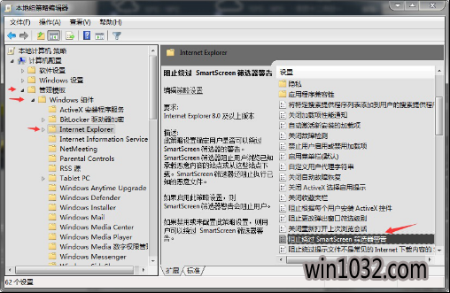2、在打开的本地组策略编辑器中,点击“管理模板”——“Windows组件”——“Internet explorer”子项——“阻止绕过SmartScreen筛选器警告”