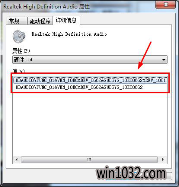4、在打开的属性窗口中,切换到“详细信息”标签页,选择“硬件ID”,就可对设备的硬件ID进行读取了。