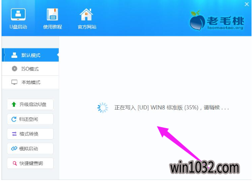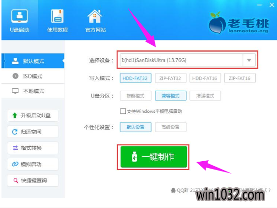 点击老毛桃u盘启动盘制作工具后,将u盘插入电脑usb接口,程序会自动扫描,只需在下拉列表中选中用于制作的u盘,然后打开“一键制作”按钮