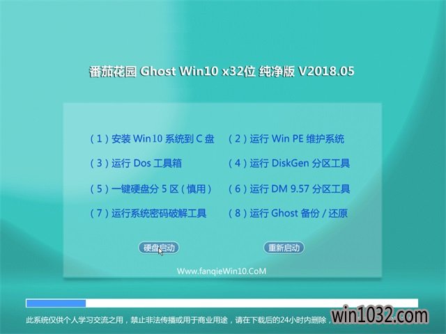 番茄花园Win10x32位纯净版系统仅用于进行演示基于万能GHOST的快速部署技术,除了系统和光盘中明确标识为原创 作品的软件外,其他的全部文件归属于原版权人所有。我们不承担任何技术和版权问题,没有提供任何技术支持的义务.请勿将本系统用于商业用途。