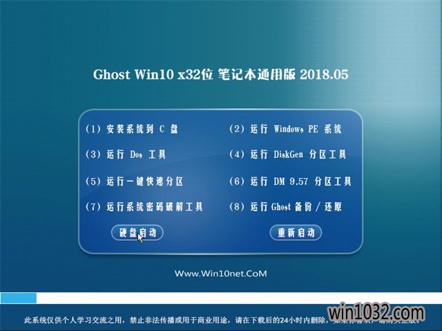 电脑店Win10x32位装机版系统仅用于进行演示基于万能GHOST的快速部署技术,除了系统和光盘中明确标识为原创 作品的软件外,其他的全部文件归属于原版权人所有。我们不承担任何技术和版权问题,没有提供任何技术支持的义务.请勿将本系统用于商业用途!