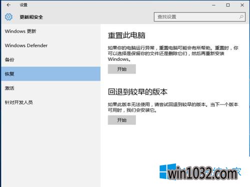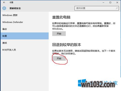 4、选中恢复后,右方有两个选中,一个为重置此电脑,这一项是为重装windows10使用的,二为回退到较早的版本,就是大家此行的目的,选中下方的开始。