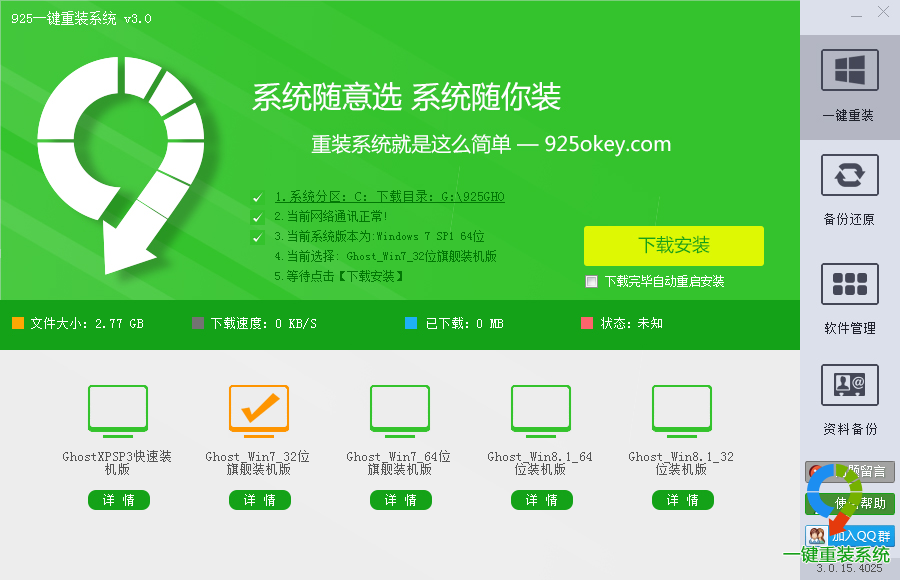 功能简介925一键重装系统是一款实用的一键重装系统软件,非常适合装系统菜鸟实用,无需任何技术,只要连接网络,一键即可开始帮你重装系统。