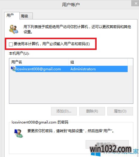 3、进入win10账号设置后,首先将“使用本计算机,网友必须写入网友名和密码(E)”前面的“勾”去掉;