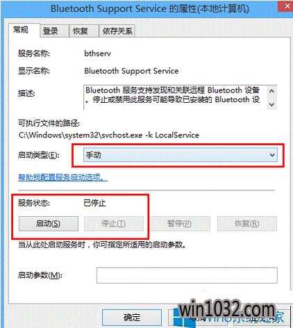 2、其次,在蓝牙服务上打开鼠标右键,点击“属性”,启动类型选中成“手动”,服务状态处打开“启动”,启动此服务便可。