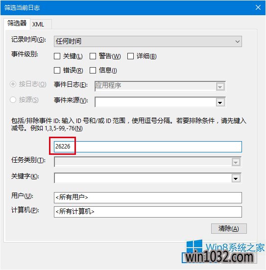 3、在窗口正中间一行写入事件ID“26226”,打开“确定”,如下图。