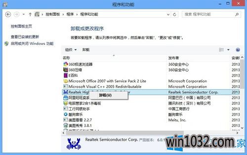 4、程序和功能菜单,选择欲删除的程序,鼠标右键,卸载。
