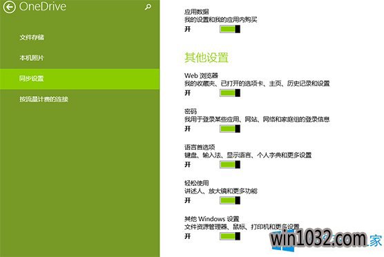 3、在一点界面下,使用组合键“win+I”,点击Modern版电脑设置,选中OneDrive中的同步设置栏目,搜索其他设置,分别点击web浏览器同步功能,如下图;