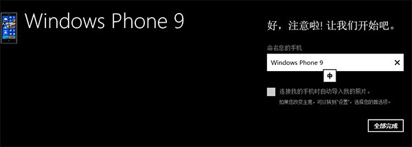 2、首次使用windows Phone应用时,工具将自动提示wP网友修改设备名称,例如重命名“windows Phone9”;当然也可以修改为“iPhone10,Android100,OS X1000,windows9等等个性名称”;