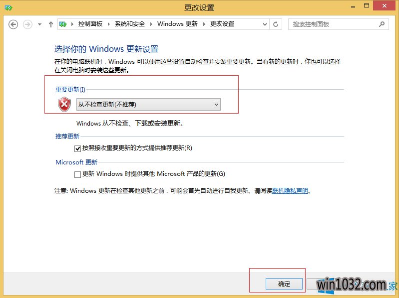 以上就是win10关闭系统更新功能的办法了,办法很简单,大家只需要点击“控制面板”,然后进入“系统和安全”,以后在打开“启动和关闭自动更新”,最后在跳出来的框中,大家选中关闭自动更新功能在确定便可。
