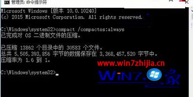 2、在管理员:命令提示符窗口,写入compact /compactos:always命令后回车,等待系统自动完成便可.