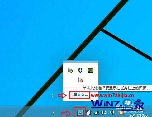 1、首先在win10系统中,登陆QQ,然后打开任务栏右下角【显示隐藏的图片】箭头,然后打开【自定义】;
