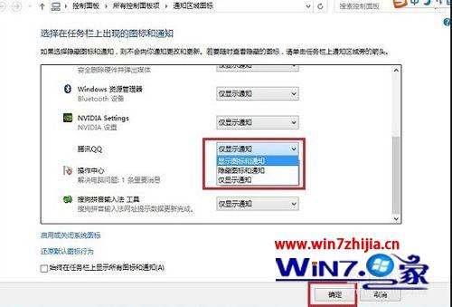 2、在跳出的“通知区域图片”界面中,找到腾讯QQ,然后将行为改为【显示图片和通知】,完成后,打开底部的“确定”。